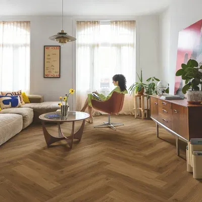 This flooring features a rich caramel oak color with a stylish herringbone pattern that adds elegance and warmth to any interior. Its natural wood-style finish creates a refined and inviting look. Compact dimensions make it versatile for various room sizes, while the durable construction ensures long-lasting performance. Ideal for both functional and decorative flooring needs.