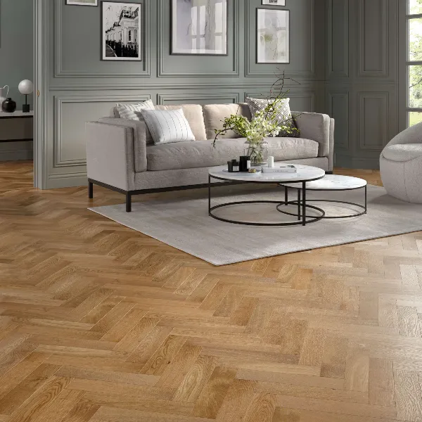 Driftwood Oak Parquet features a classic oak herringbone design with a brushed matt lacquered surface for a refined, natural look. The real wood top layer highlights the character and grain of oak while offering a contemporary finish. Its engineered construction provides strength, stability, and long-term performance. The flooring is suitable for installation over underfloor heating when fully bonded, making it a versatile choice for modern interiors.