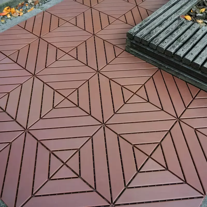 Set of 44 interlocking PVC decking tiles in brown geometric pattern. Durable, moisture- and weather-resistant, with easy snap-together installation for patios, terraces, gardens, and balconies.